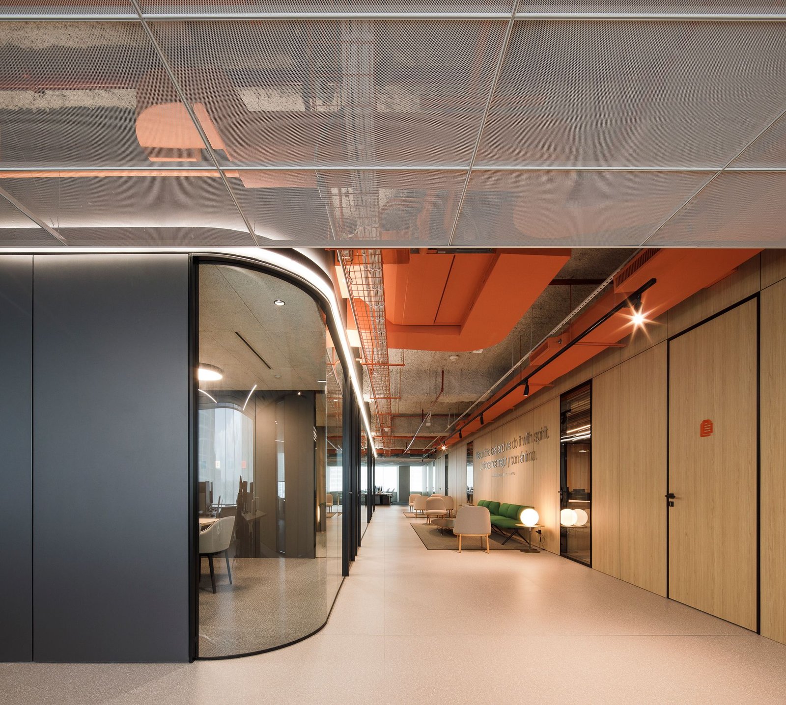To achieve this, we implemented strong colors typical of Liberty's corporate identity, such as orange and dark gray, which are seen in furniture, carpets, and walls, balanced with light oak wood elements that inject warmth into the spaces.